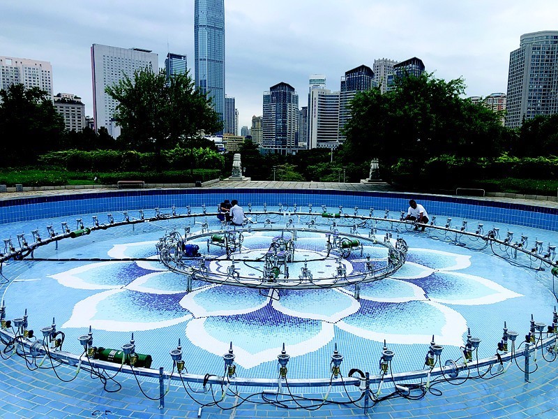 修复遵循历史风貌,直径20米的原水池结构得以保留,施工中对原有瓷砖、马赛克等进行细致修复,外圈1.8米宽马蹄石拼色铺装延续原有细腻质感。池底蓝天白云色调的类莲花造型马赛克,与周边景观共同构成开阔视野,景观层次丰富,动静相宜。