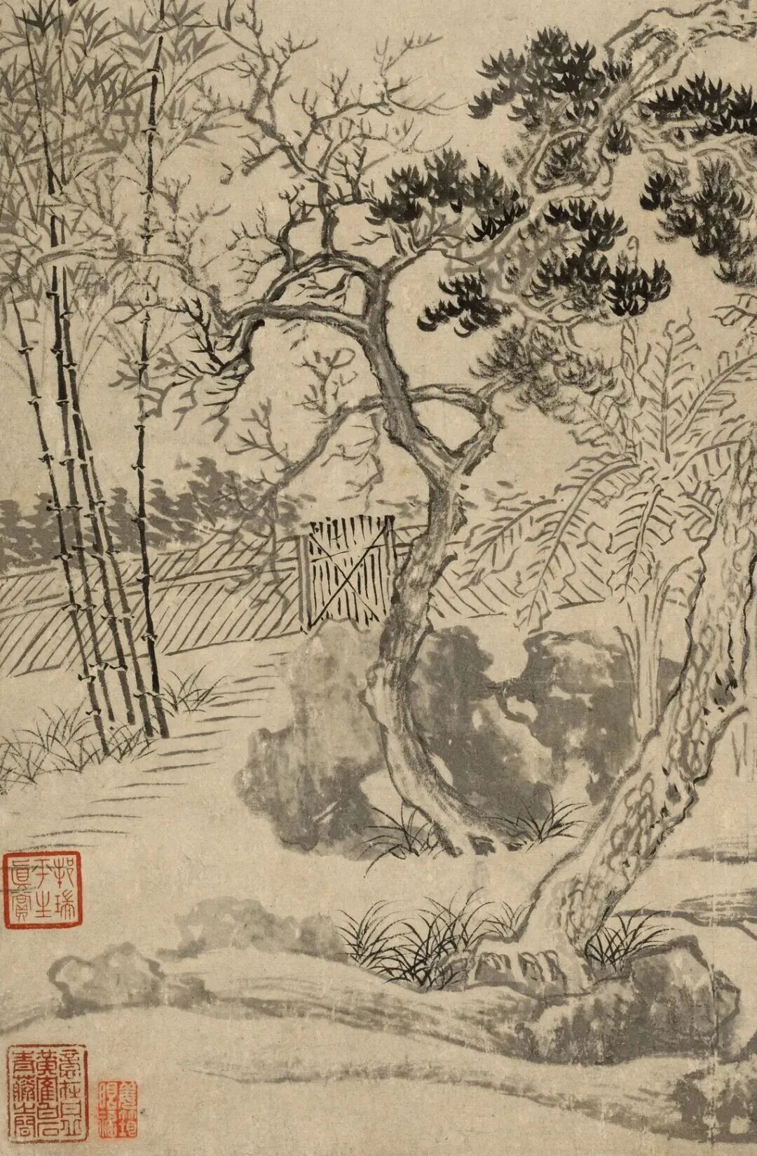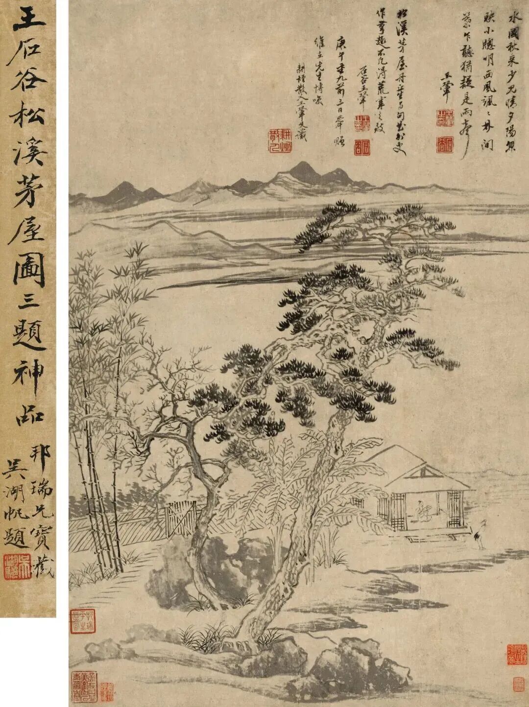 王翚这《松溪茅屋图》,画得那叫一个讲究!画面上,苍松独立,翠竹几竿,矮屋一椽,围着短篱,清流绕过,一士人在绿竹、碧水、青山映照下,启户读书,屋外孤鹤徘徊,像在等主人。